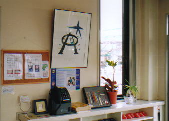 掲示版には海外の歯科情報も、 待合室です。子供のオモチヤもたくさんあります。