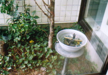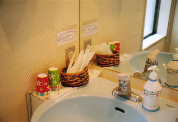 使い捨ての歯磨きセットを用意しています。 中庭です。ハンドメイドの噴水はただいま修理中